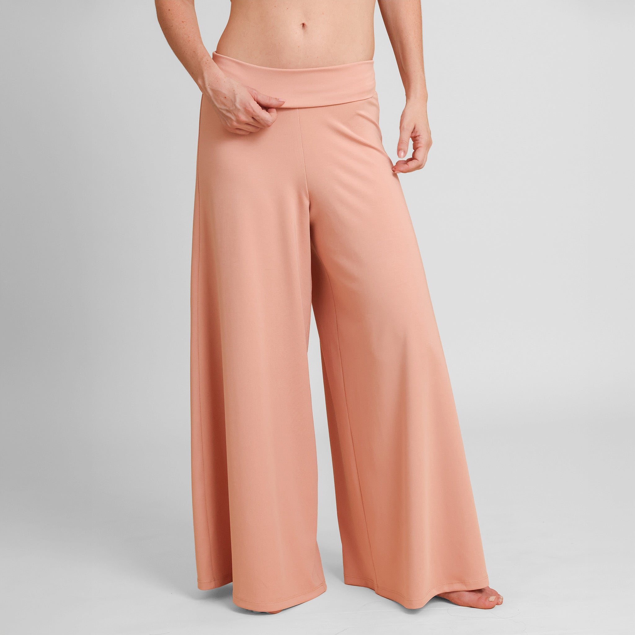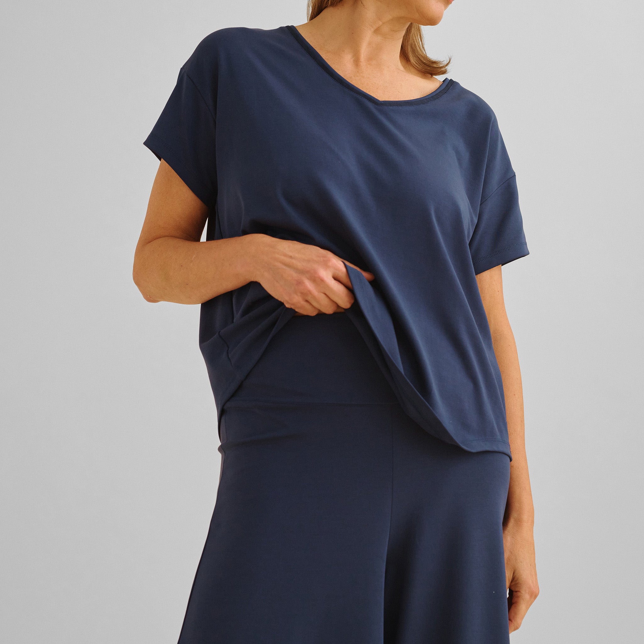 While our signature A DOMANI material has the *feel* of a high performance fabric (which usually means mysterious synthetics), it's actually a signature knit made from natural fibers—eucalyptus, birch, beech, and pine. These all-natural fibers are paired with a thoughtful trace weaving of 7% sensitive-skin-approved elastane to ensure stability, longevity, and to maintain and support the natural stretch of the knit wood fibers throughout a lifetime of spin cycles and dance parties.